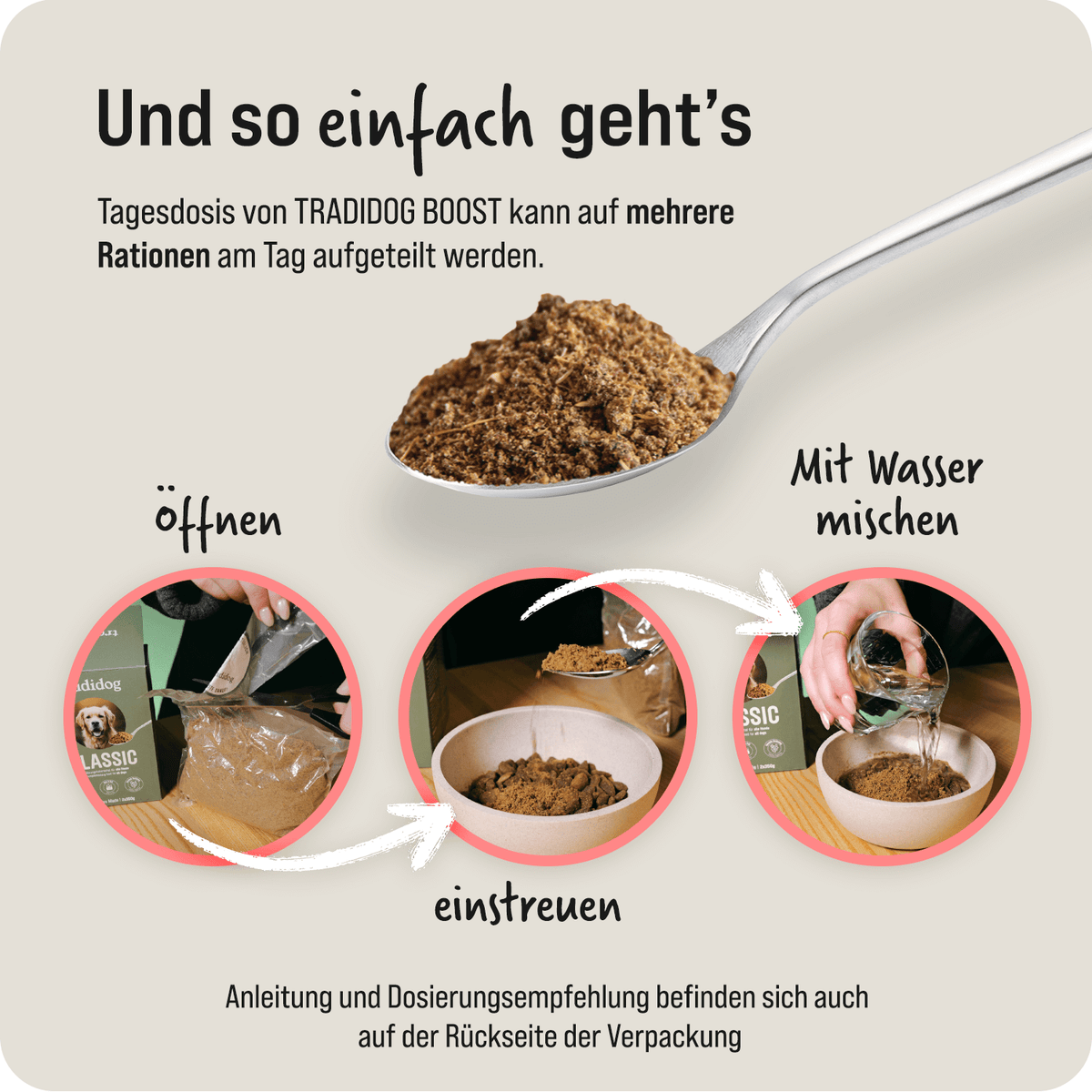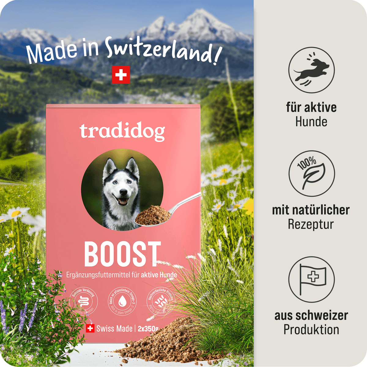 Bei Tradidog steht dein Hund im Mittelpunkt – jeden Tag, bei jeder Entscheidung. Wir produzieren alles selbst und ausschliesslich in der Schweiz, mit der Sorgfalt und Präzision, die du von Schweizer Qualität erwarten darfst. Unsere Zutaten sind rein natürlich, stammen aus kontrolliertem Anbau und werden so verarbeitet, dass ihre volle Pflanzenkraft erhalten bleibt. Denn wir glauben: Was deinem Hund wirklich hilft, kommt aus der Natur – und aus echter Verantwortung.