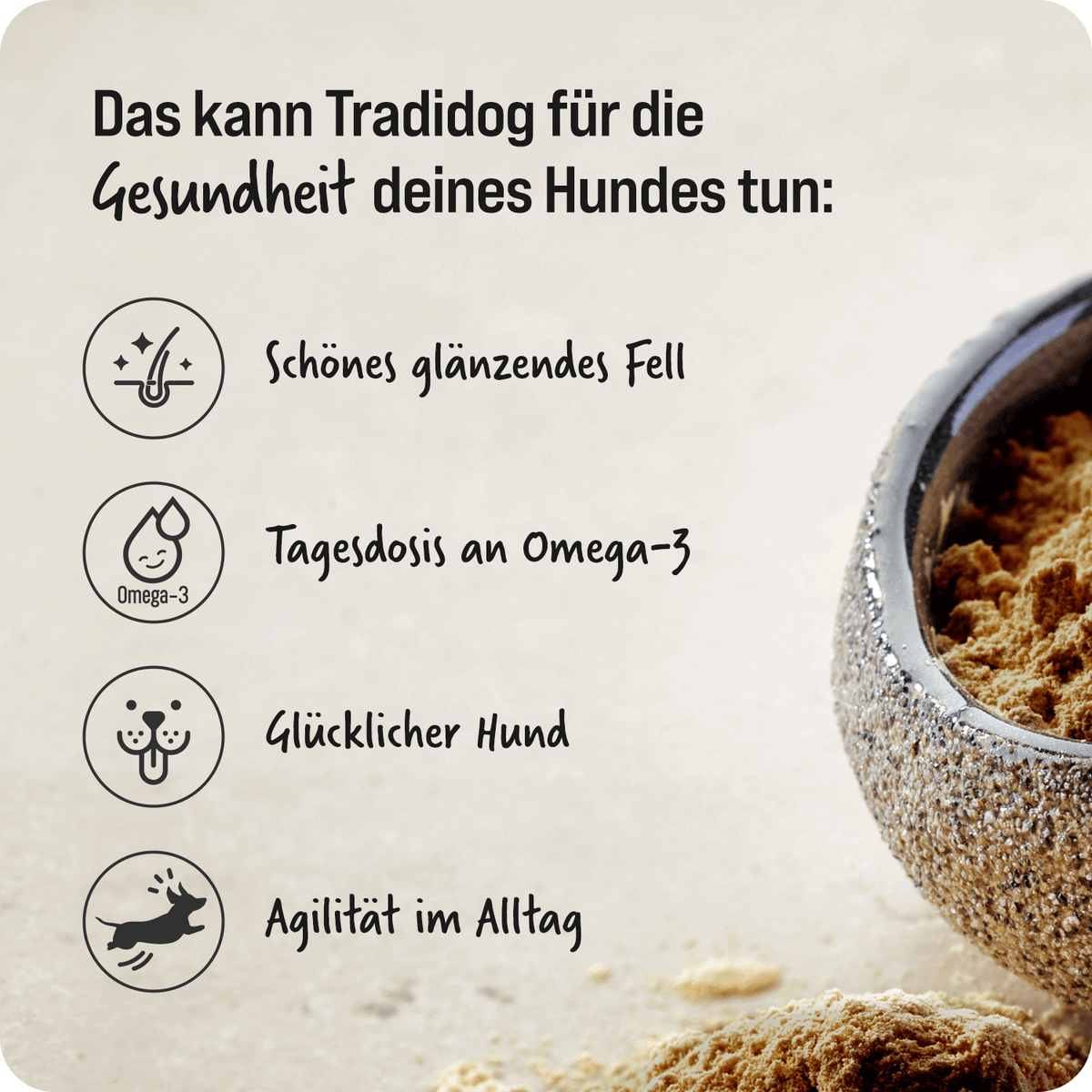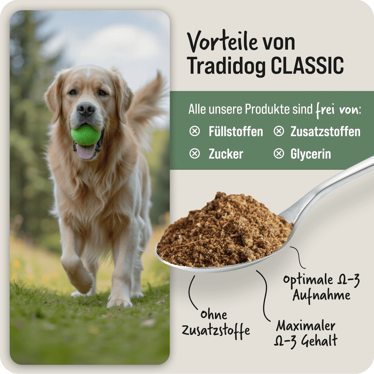 Die meisten handelsüblichen Futtermittel enthalten maximal 2g Omega-3 pro Tagesration, was nur etwa 50% des empfohlenen Bedarfs für mittelgroße Hunde entspricht. Das Tradidog Futtertopping liefert hingegen 2.46g Omega-3 pro Portion – und deckt damit den Bedarf optimal ab. So wird dein Hund gezielt mit hochwertigen Omega-3-Fettsäuren versorgt! Mehr Erfahren