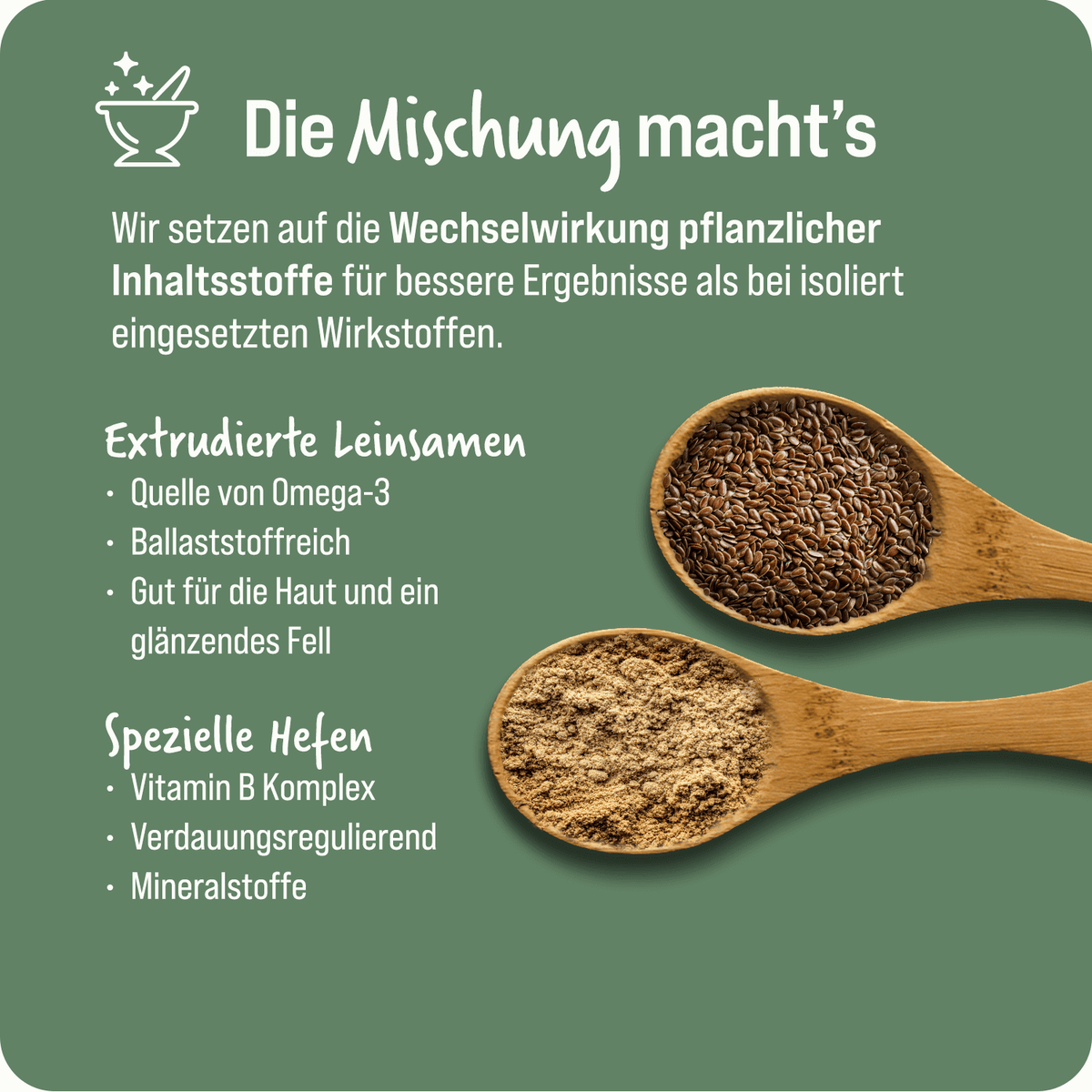 Du testest unsere Futtertoppings 90 Tage lang – ganz ohne Risiko. Wenn du in dieser Zeit keine sichtbaren Verbesserungen bei Fell, Verdauung, Vitalität oder Lebensfreude bemerkst, erhältst du dein Geld zurück.