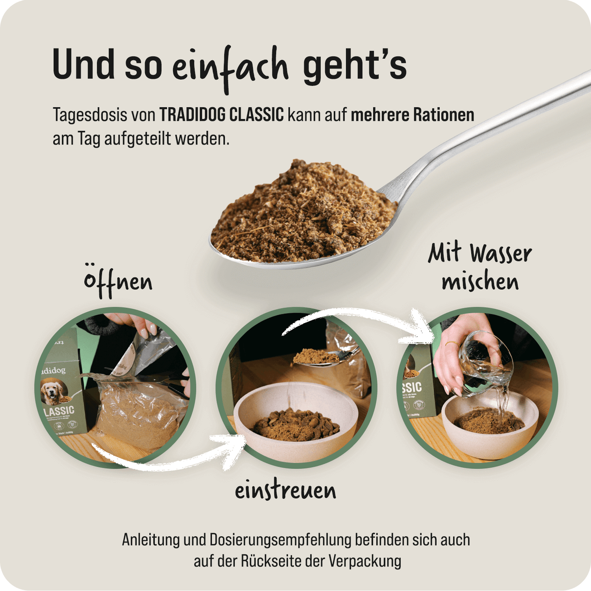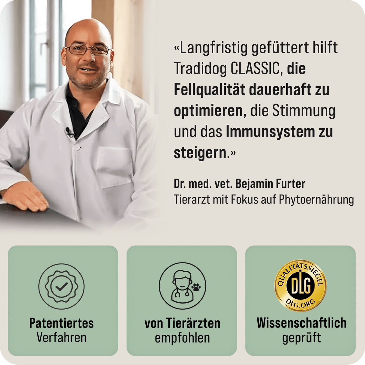 Bei Tradidog steht dein Hund im Mittelpunkt – jeden Tag, bei jeder Entscheidung. Wir produzieren alles selbst und ausschliesslich in der Schweiz, mit der Sorgfalt und Präzision, die du von Schweizer Qualität erwarten darfst. Unsere Zutaten sind rein natürlich, stammen aus kontrolliertem Anbau und werden so verarbeitet, dass ihre volle Pflanzenkraft erhalten bleibt. Denn wir glauben: Was deinem Hund wirklich hilft, kommt aus der Natur – und aus echter Verantwortung.