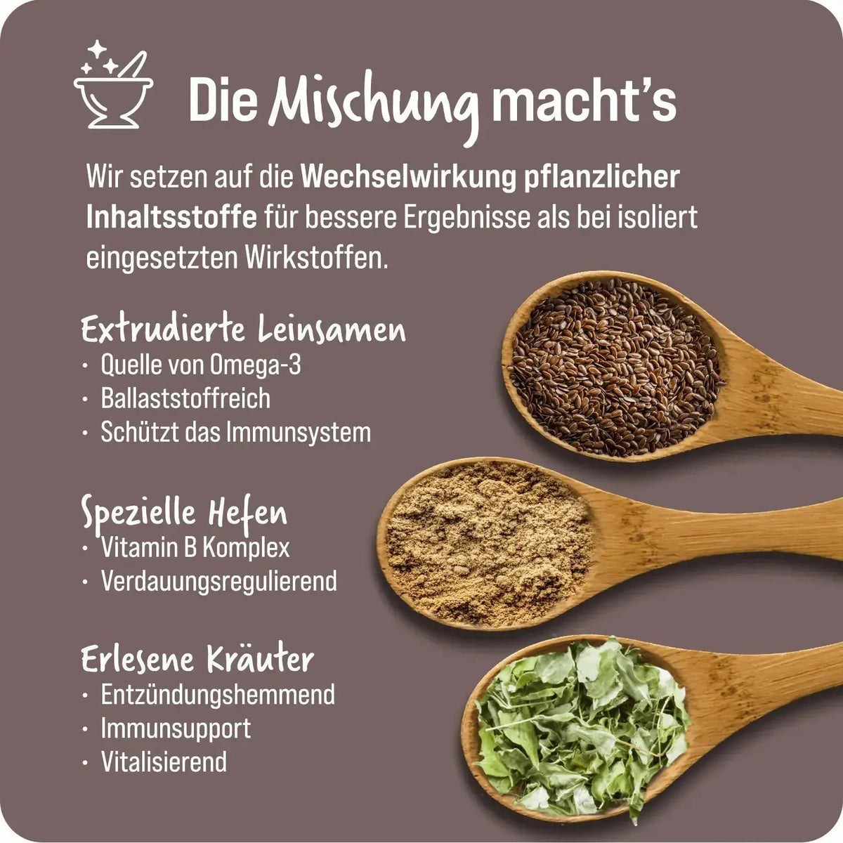 Funktionelle Hefen, Vitamin-B-Komplex und sekundäre Pflanzenstoffe aktivieren Immunzellen, fördern die Zellregeneration und helfen deinem Hund, gesund und widerstandsfähig zu bleiben.