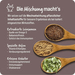 Omega-3 aus hochaufgeschlossene Leinsamen stärken die Hautbarriere und verbessern die Zellstruktur für ein glänzendes, seidiges Fell und eine gesunde, widerstandsfähiges Haut.